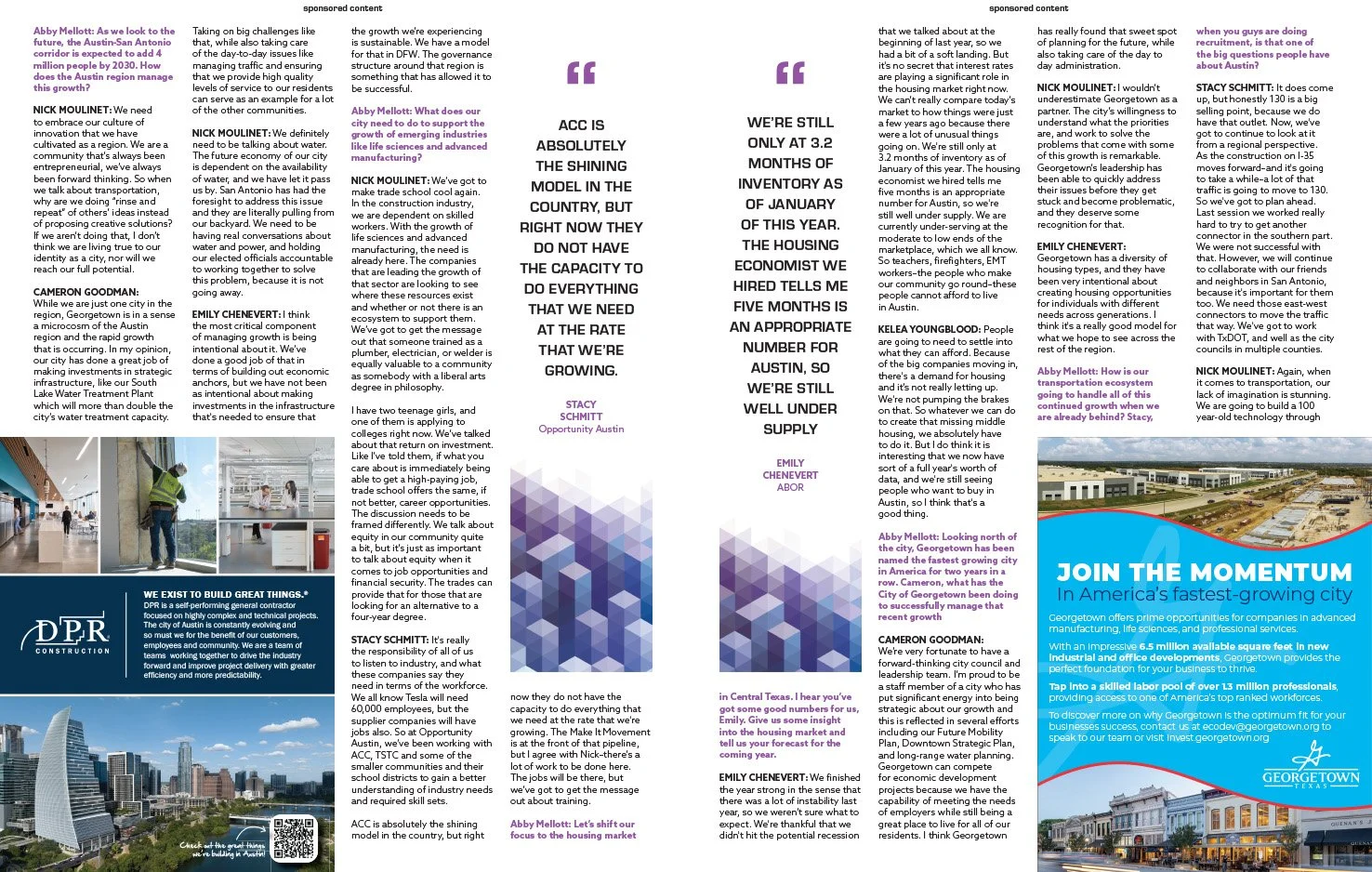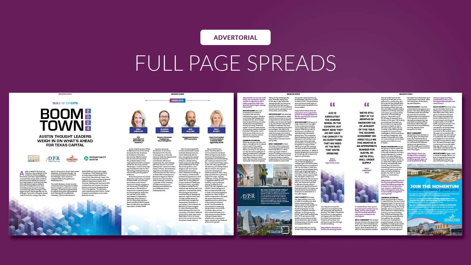 Geometric and abstract elements are what drove the theme behind the design of these spreads. Since Austin is a major city in Texas, I wanted to imply buildings or cityscapes for the cover page.